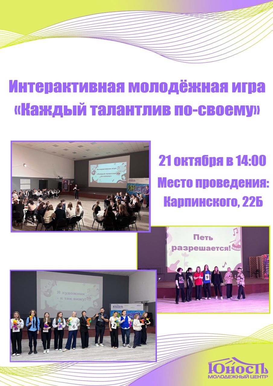 21 октября Молодёжный центр «Юность» приглашает тебя на интерактивную игру «Каждый талантлив по-своему»!