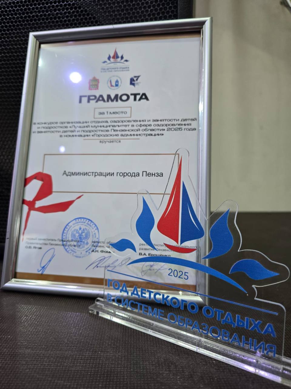 По итогам Конкурса организации отдыха, оздоровления и занятости детей и подростков «Лучший муниципалитет в сфере оздоровления и занятости детей и подростков Пензенской области» Администрация города Пензы награждена Грамотой за 1 место в номинации «Городские администрации».